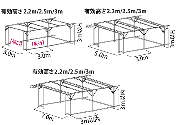 | 間口 \ 奥行 | 3.0m(4本柱) | 5.0m(6本柱) | 7.0m(6本柱) |