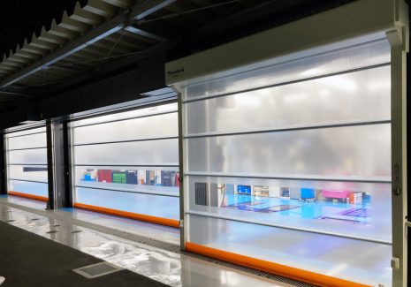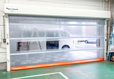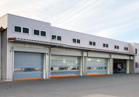 自動車整備場の空調効率を上げるため、出入口に開閉速度の早い電動シートシャッターを設置しました。