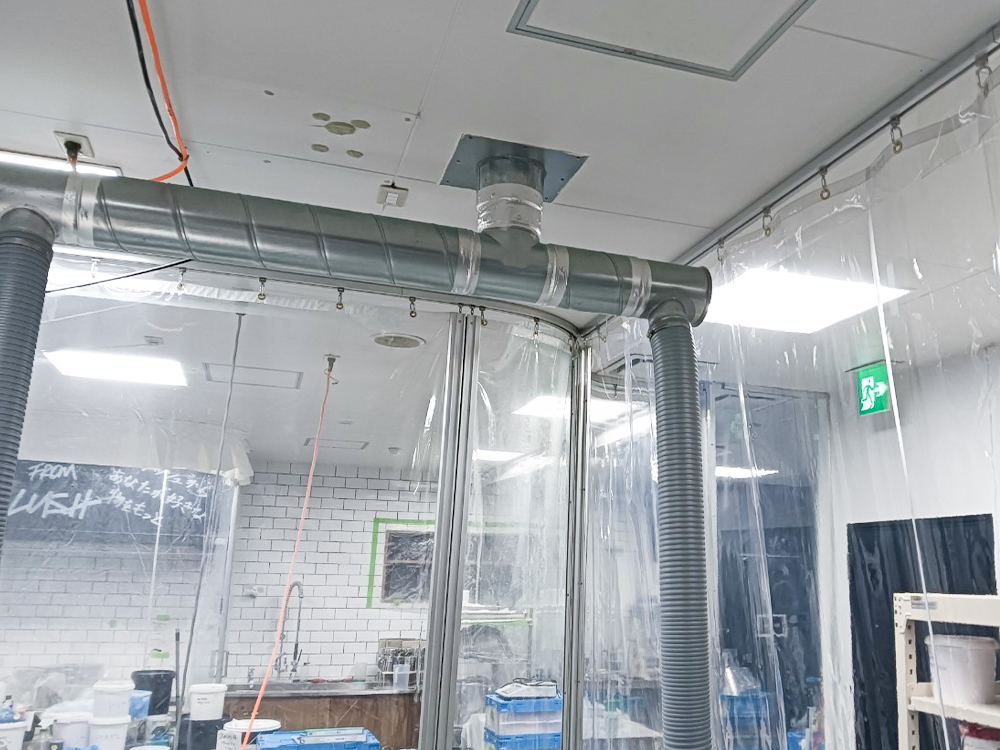 カーブレールを使用して工場の作業場を透明ビニールカーテンで間仕切り