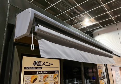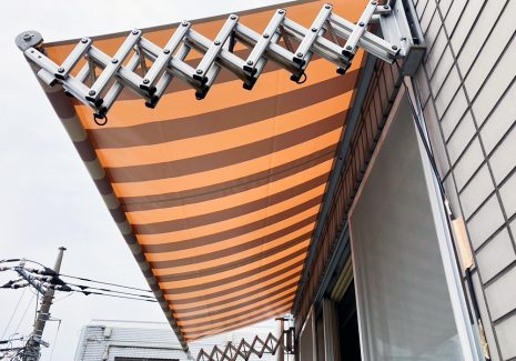 屋外の鋼管ラックの雨除けにローリングシェード付オーニング