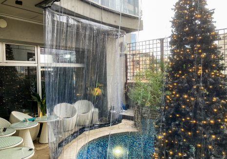 ダイニングバーのプールサイドに透明ビニールカーテン