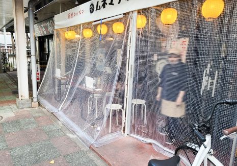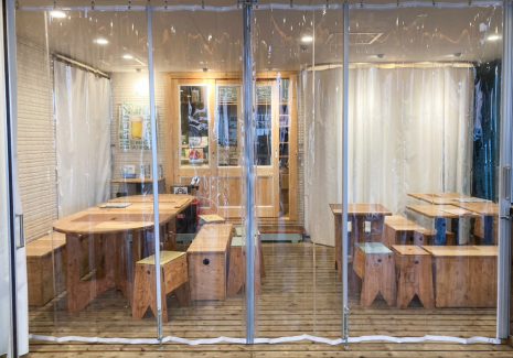 オープンカフェ出入口に防寒用透明ビニールカーテン