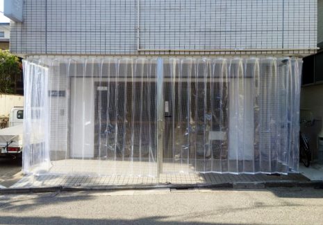マンションの共用通路に雨よけビニールカーテン