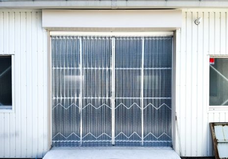 工場の出入口に雨よけのためのアコーディオンドア設置