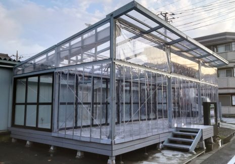 新規オープンする居酒屋のテラス席に透明ビニールカーテン設置