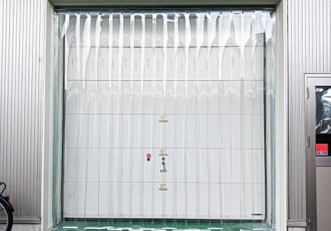 食品工場のシャッターにビニールのれんカーテン