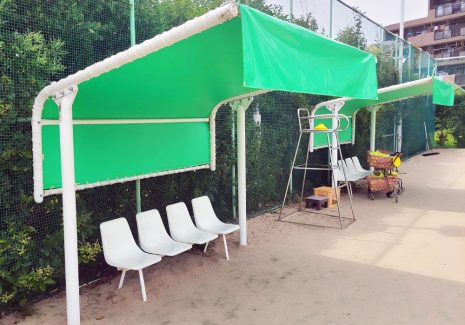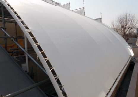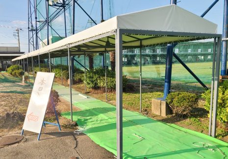 ゴルフ練習場の雹で傷んだ通路テントを張替え
